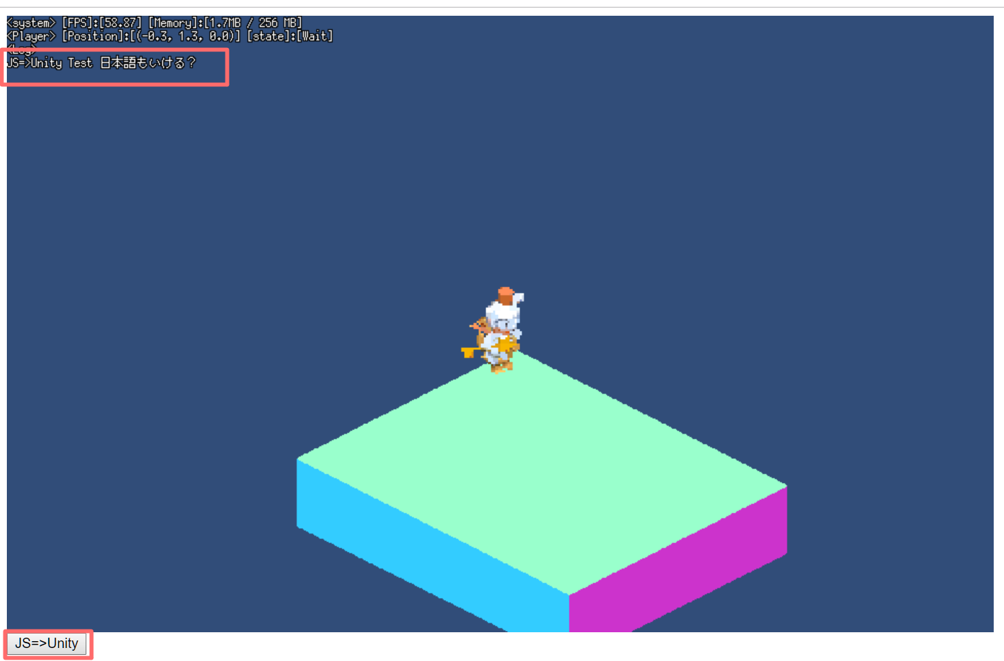 [GameDev]Unity<=>JS連携 その1(まず開通) 開発 2018.09.20 UnityからJavaScriptの関数を呼び出し(今回はふつーにAlert) 文字列の引数渡しもOK。 HTMLのボタンのOnclick→JavaScript→Unity側の関数を呼び出し(同じくふつーにDebug.Log) 次と備忘録 ・JS=>Unityにて、イベント実行が可能かどうかのチェックを行うこと(直呼び出しの規制) ・Unity側にてセーブデータをもとにJSONを生成、JavaScriptの関数に渡してHTMLへ展開