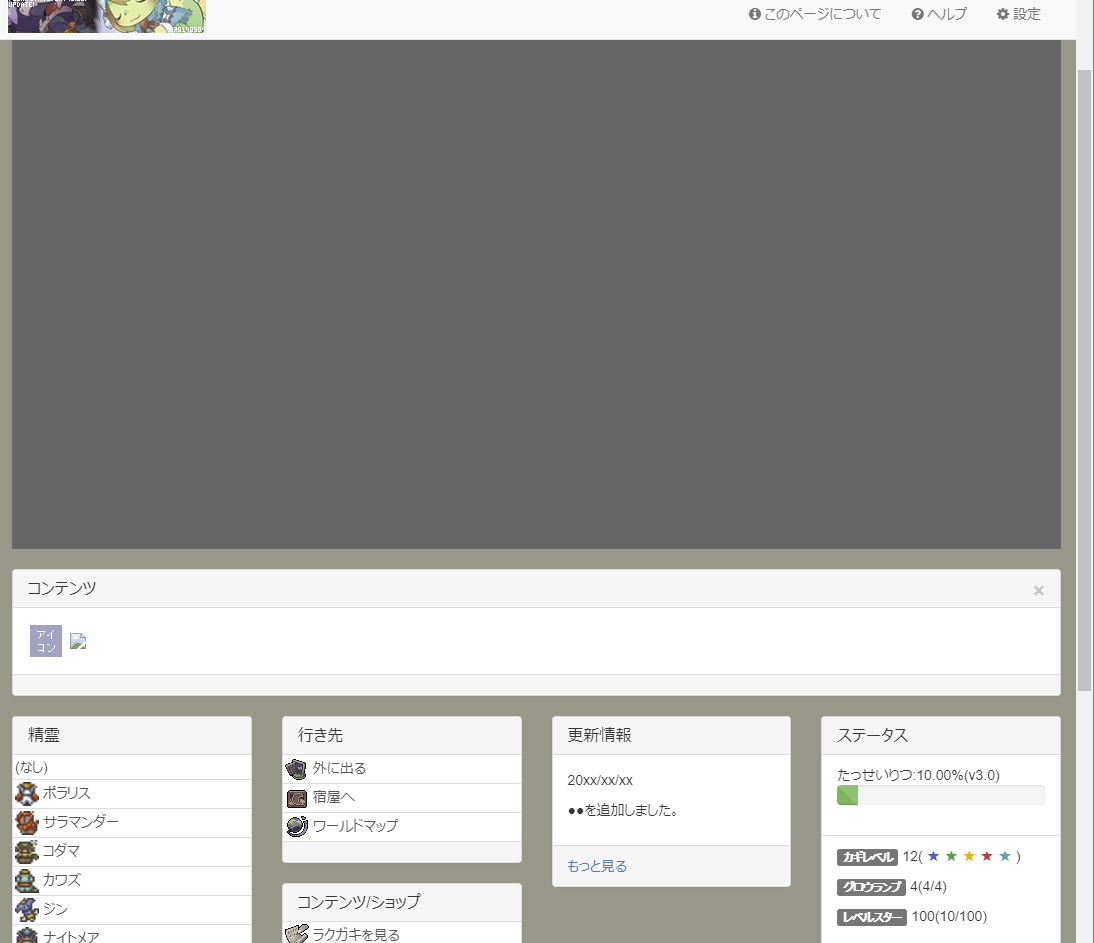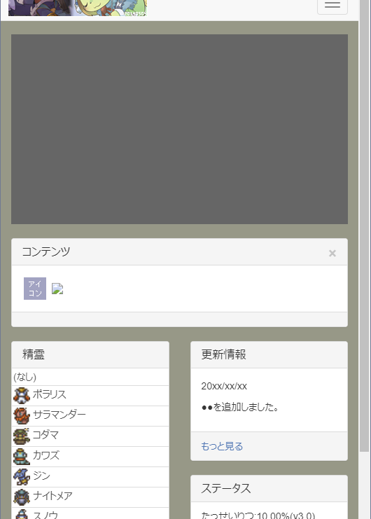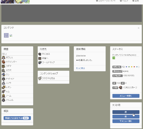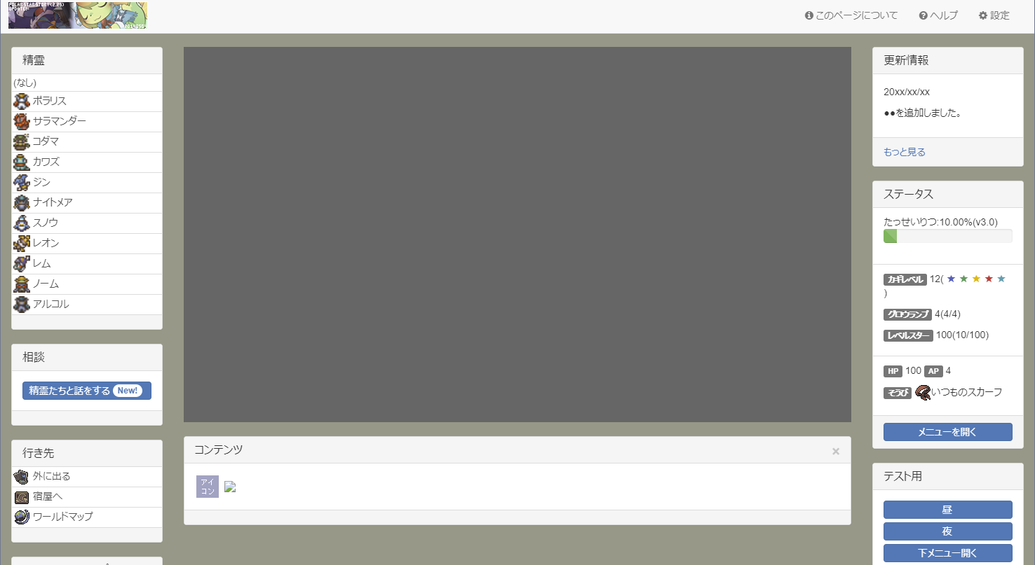 [GameDev]Unity<=>JS連携 その3.5(枠作成の続き) 開発 2018.10.01 いろいろと手を入れる…。 レスポンシブ ▲モバイル(いるのか?) ▲SD解像度 ▲HD解像度 昼/夜 ▲SPAでいくので、フェードで背景切り替え。パネルの色変えは…宿題で。 コンテンツ枠 ラクガキリストとか同人リストとか図鑑リストとか。 左右に置くと広くなる部分はゲーム表示領域の下に配置する。 モーダル系とともに外部ファイルに中身を置けるように。