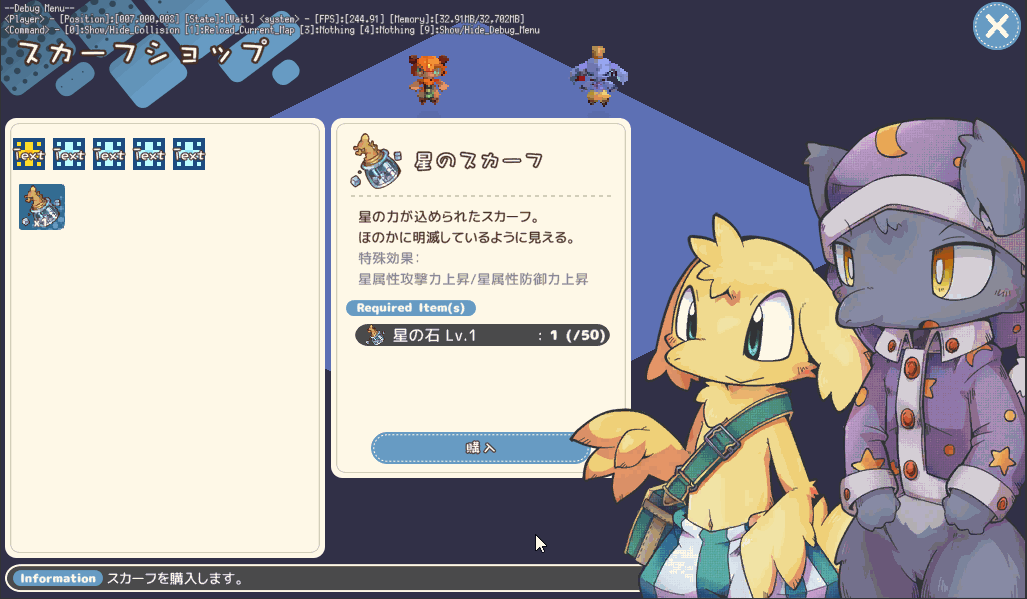 [GameDev]ショップUI その0 開発 2020.07.03 テキストすら整備してない仮画面だけど、まあ大体こんな感じで行こうか…。 実装部分は概ね完了。あとは購入処理くらいか。 UI画像だけ用意しておくとあとは組み合わせで楽に作れるな~。 場所が空いたのでフェイスを表示させてみる。 メルとクロース、フランドルとカストルポルックス。まあキツキツだけど入るかな。。